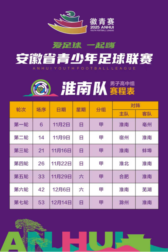 赛事预告 | 淮南VS亳州!11月2日,徽青赛激战将至,主场烽火为你点燃!【主场战鼓擂响!淮南青少年亮剑徽青赛!】安徽青少年足球联赛(徽青赛)男子高中组甲组淮南赛区的首轮对决即将拉开战幕!淮南队坐镇主场,迎战亳州队,两队首度交锋,绿茵场上必将精彩纷呈!本届徽青赛第一阶段比赛,淮南队将经历7场激烈比拼,其中3场关键主场战役的胜负,将直接影响最终比赛成绩。诚邀全市球迷到场,为家乡球队呐喊助威!这片绿茵